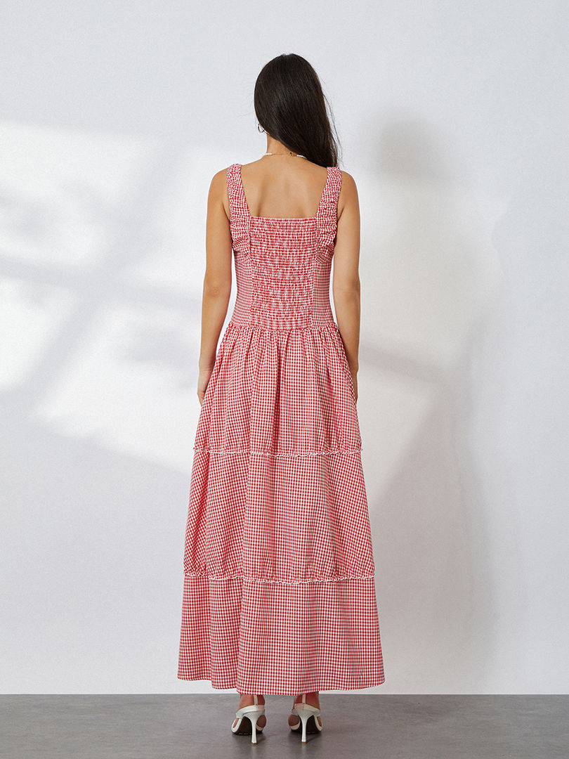 This is an ankle-length dress crafted from soft velvet fabric. It features a flattering fit and flare silhouette with an empire waist and a classic square neckline. Delicate diamond embellishments add a touch of sparkle.