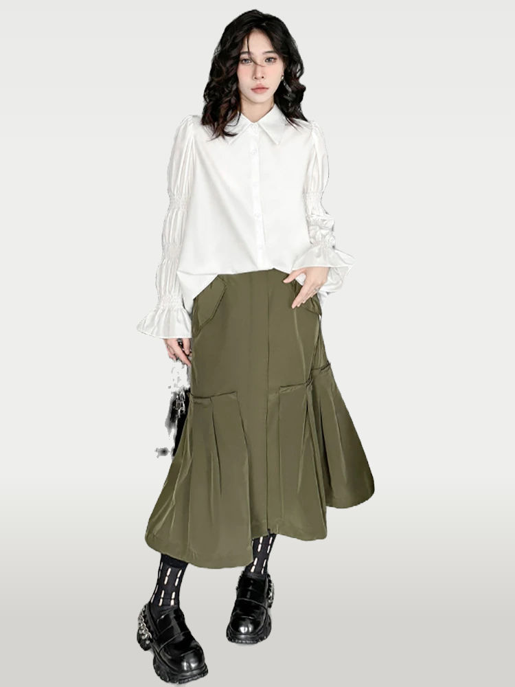 Women White Big Size Casual Blouse New Lapel Long Lantern Sleeve Pleated Shirt