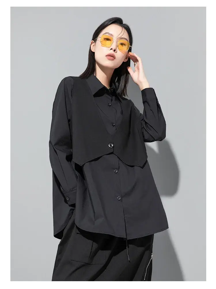 Women White Color-Block Fake Two Pieces Big Size Blouse New Lapel Long Sleeve S