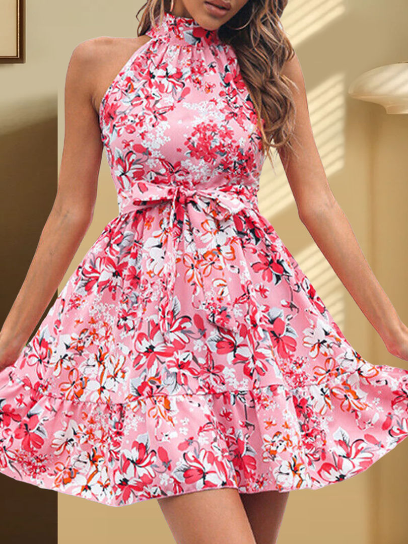 Peach Floral Print Mini Dress A-LINE Ruffle Hem Bow Batwing Sleeve Appliques