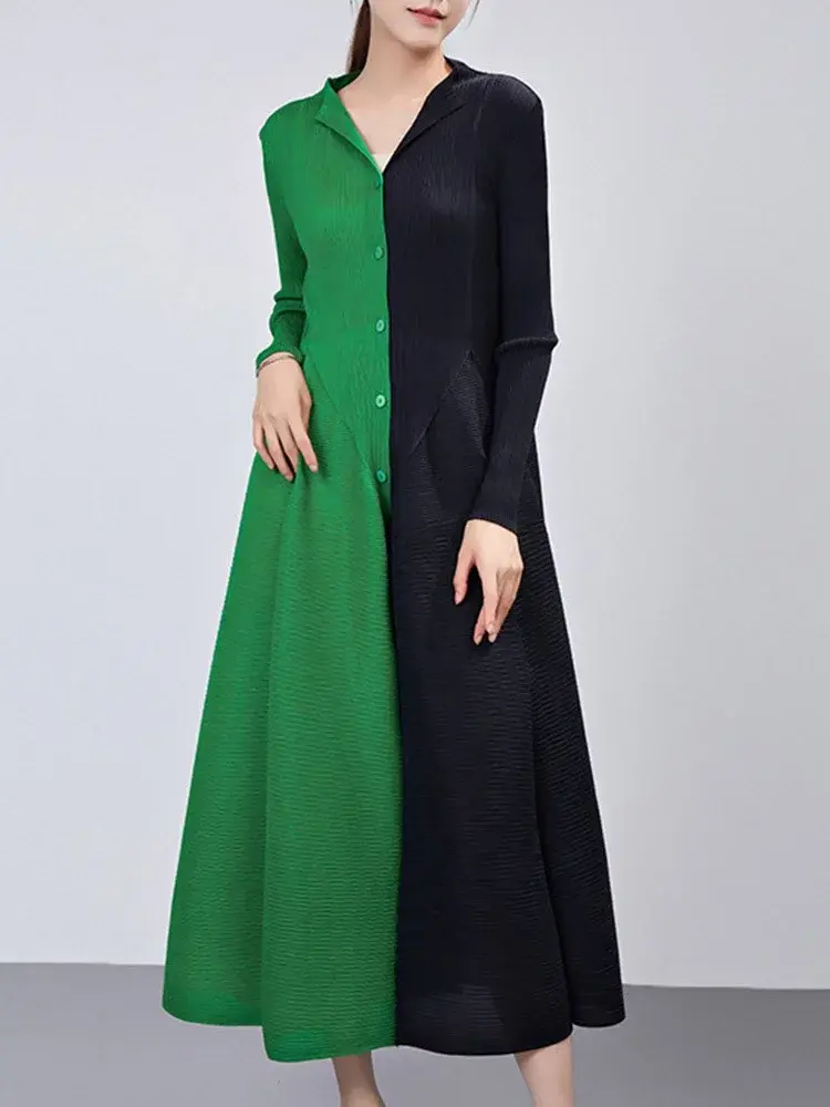 Contrast Color Pleated Dress, Single Breasted A-Line, Round Neck Midi Gown