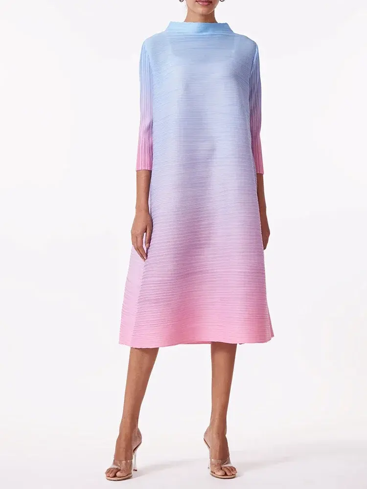 Tags: long sleeve gradient pleated dress, pink orange ombre midi dress, miyake style pleated a-line dress, turtleneck pleated dress for work, elegant office lady midi dress, high stretch comfortable work dress, all season gradient color dress, women's full sleeve pleated dress, loose fit a-line midi dress, pullover pleated dress mid-calf, professional yet comfortable dress, gradient pleated turtleneck dress, pink and orange pleated dress, elegant pleated dress for women